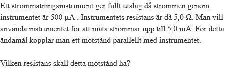 Strömmen 5 mA ska delas så att 0.5 mA ska gå genom mätinstrument och resten (4.5 mA) ska gå genom det parallella motståndet.