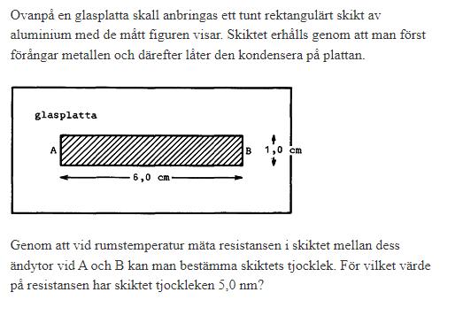 Skiktet är ungefär som en sladd. Om sladden är längre så är resistansen högre. Däremot gör ett större tvärsnitt att resistansen blir lägre. Här vet du längden, men ska beräkna tvärsnittet så att resistansen blir den önskade.