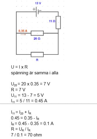 En resistor med okänd resistans samt två andra resistorer är anslutna till ett 13V-batteri. Strömmen genom resistorn med 20 Ω är 0,35 A. Beräkna resistansen R.