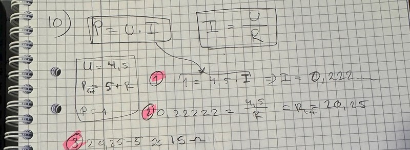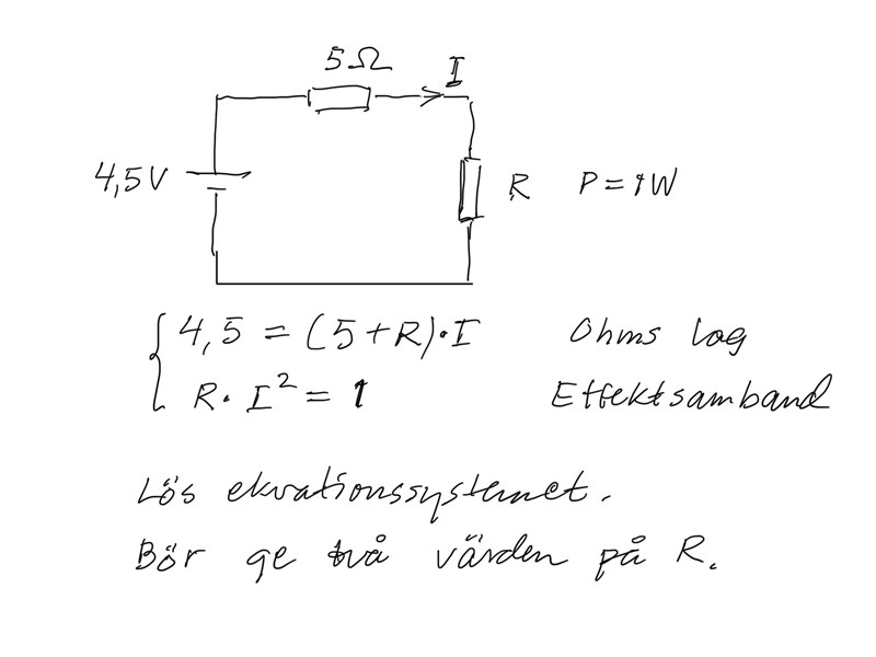 Ett motstånd med resistansen R är seriekopplat med ett 5,0 OHM -motstånd. Motstånden är anslutna till en polspänning av 4,5 V enligt figuren nedan. Bestäm R så att effekten som utvecklas i detta motstånd är 1,0 w.