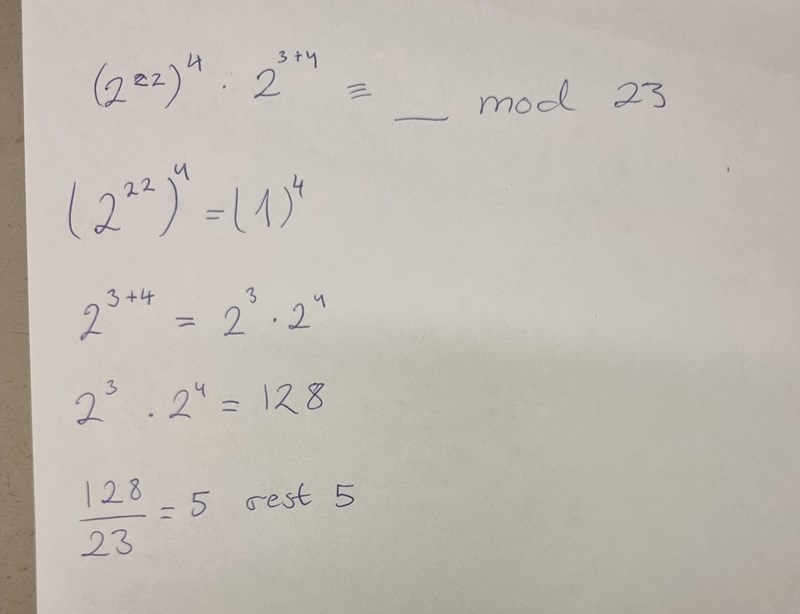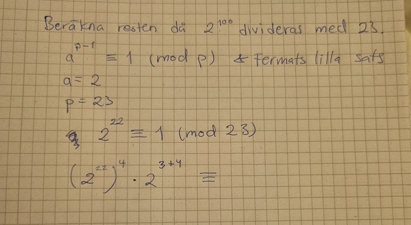 Beräkna resten då 2^100 divideras med 23. Kongruens- och moduloräkning