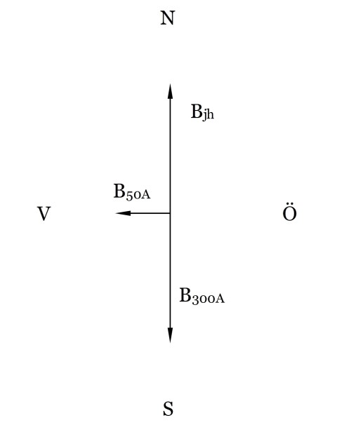 1,5 m rakt ovanför en orienterares kompass korsar två isolerade likströmsledningar varandra. I den ena ledningen går strömmen 300 A mot väster. I den andra går strömmen 50 A mot norr. Jordmagnetiska fältet har flödestätheten och inklinationen är .