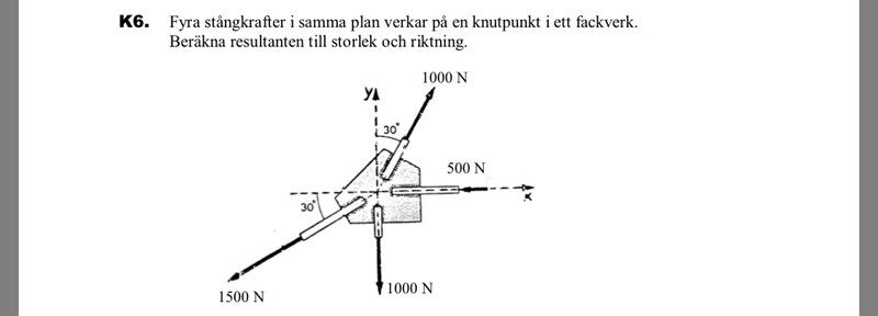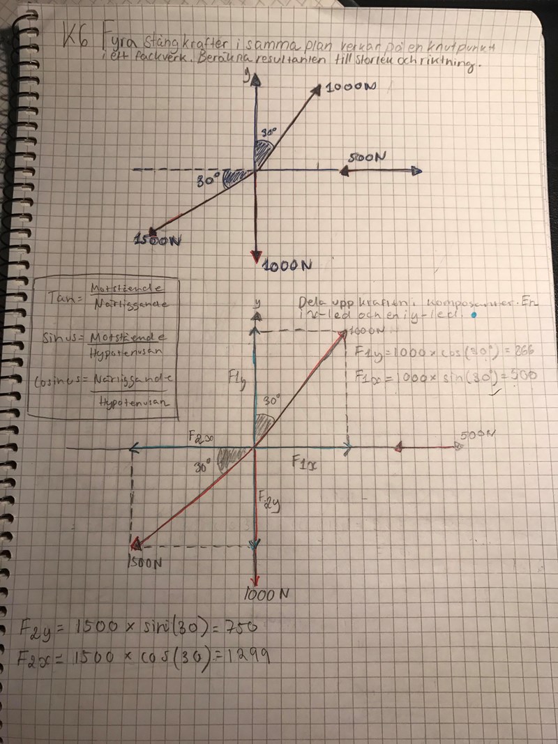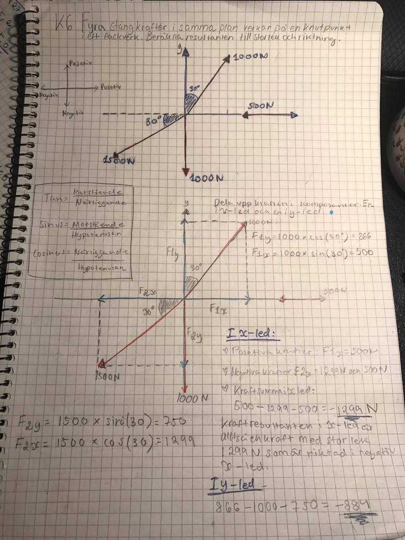 Fattar nu hur man komposant updelar. Tack! 😊 Men nu har jag problem med att summera alla Y krafter och X krafter. Hur ska jag tänka? Fattar inte heller vad jag gör med kraften som pekar helt neråt Y kraften som är 1000 N och X kraften som är 500 N som pekar tvärtom. Skulle du kunna visa hur det ser ut på papper. Det hjälper verkligen att förstå.