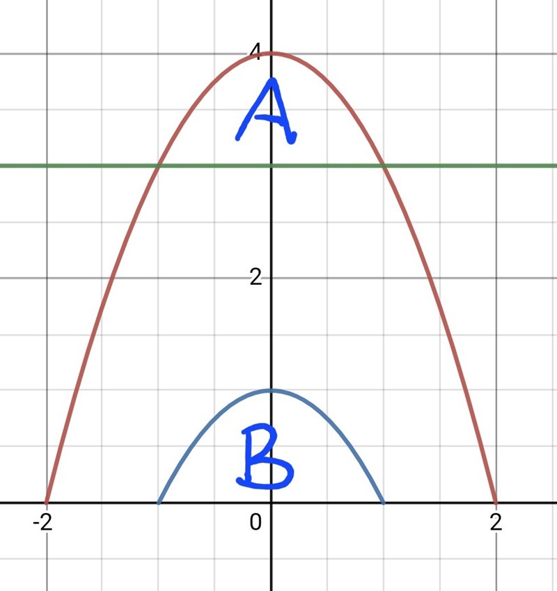 Problemet jag har är att jag inte förstår hur jag ska ställa upp en integral som beskriver volymen för A i figuren. Men borde inte den vara lika stor som volymen för figur B?