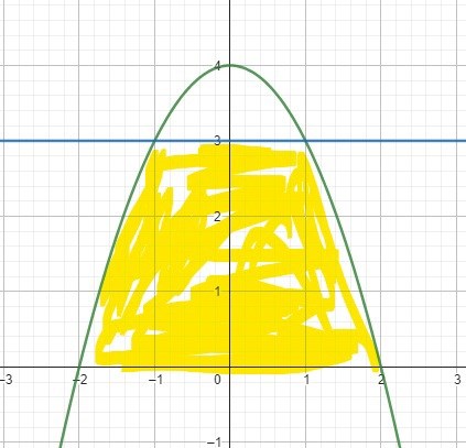 "Området mellan funktionen f(x) = 4-x2 och linjen y=3 får rotera kring x-axeln. Beräkna rotationskroppens volym." Se bild nedan för hur området ser ut.