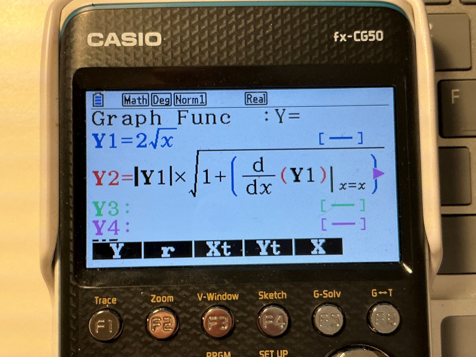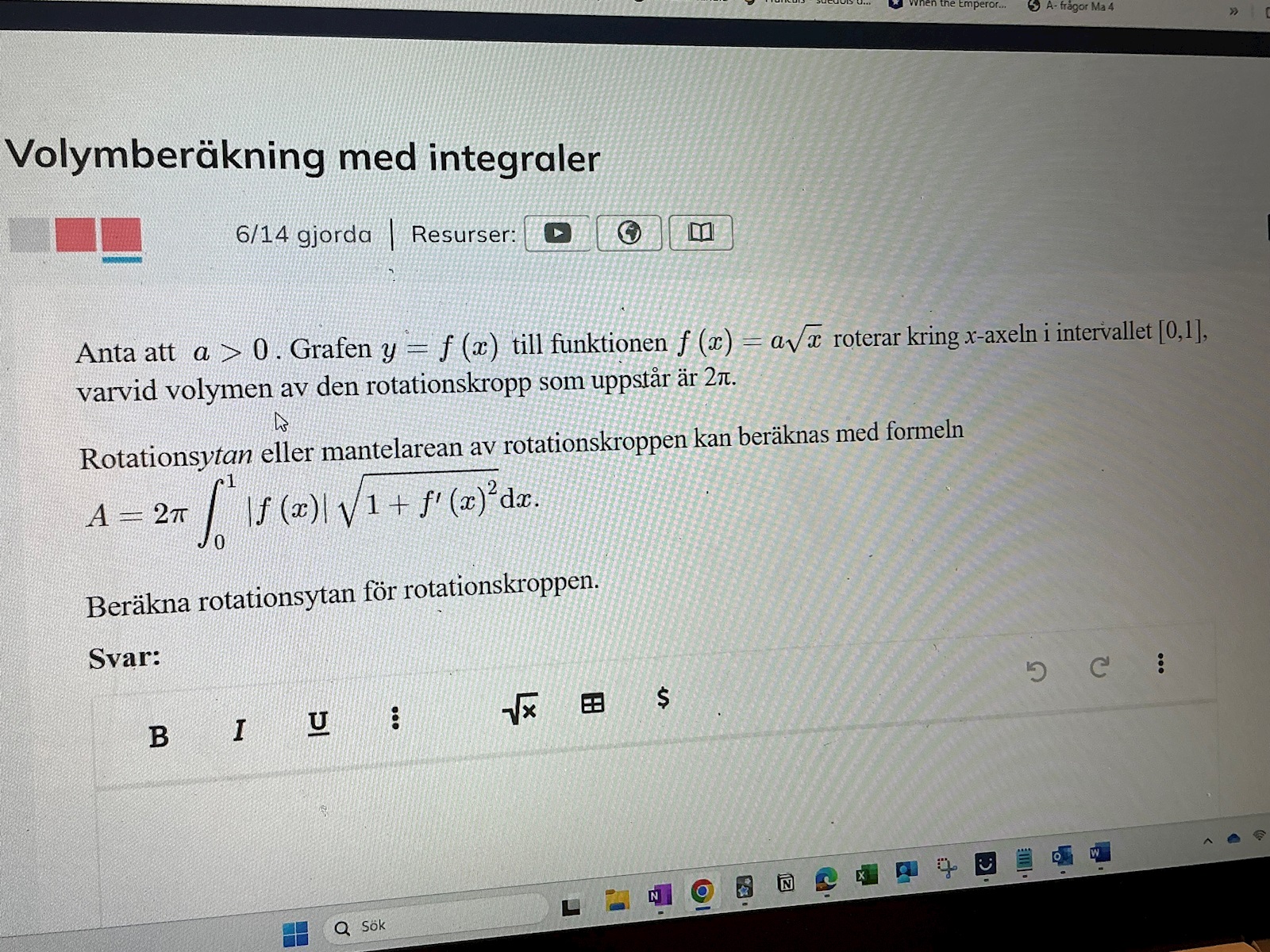 Tanken var sedan att beräkna integralen med graf ritande funktion för att till sist multiplicera med 2 pi. Kanske har jag skrivit något fel?