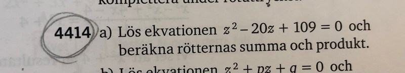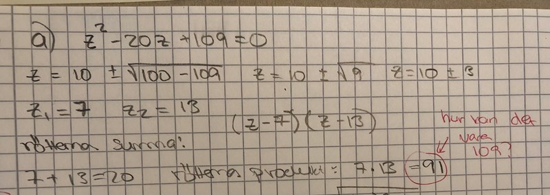 Hej! I denna uppgift fick jag att rötternas summa var 20 vilket var rätt men produkten blev 91, vilket är fel då rätt svar är 109. Vad gör jag för fel?