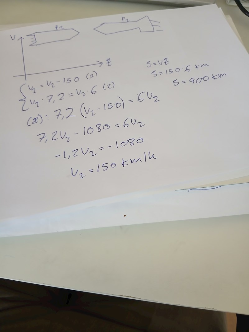 Mitt ekvationssystem säger att ena planets hastighet är 150 km/h lägre än det andras, och att de färdas samma sträcka.