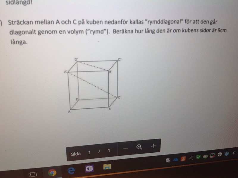 då vi vet att kubens kanter är 9 cm. När man då räknat ut längden av den gröna diagonalen