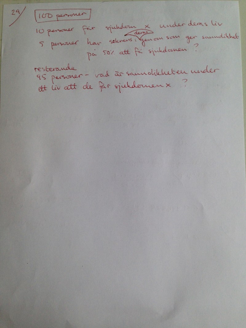 Övriga 7,5 sjuka borde höra till de 95 personerna utan sjukdomsanlag, d v s sannolikheten att bli sjuk om man inte bär på anlaget är 7,5/95=0,078 = 7,8 %.