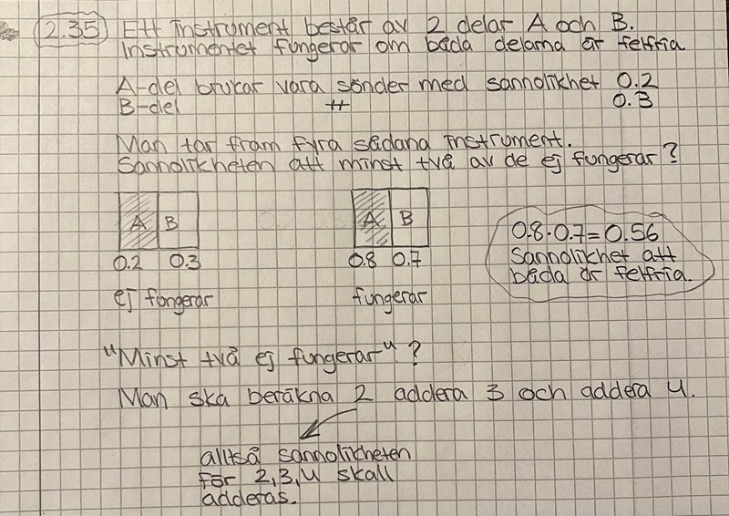 Om "minst två ej fungerar" så är det ekvivalent med att högst två (d v s en eller två) fungerar. Sannolikheten att ett instrument fungerar, d v s att både A och B är hela, är 0,8*0,7 = 0,56. (Sannolikheten att ett visst instrument inte fungerar är alltså 0,44).
