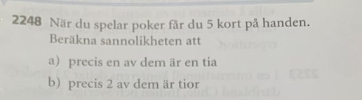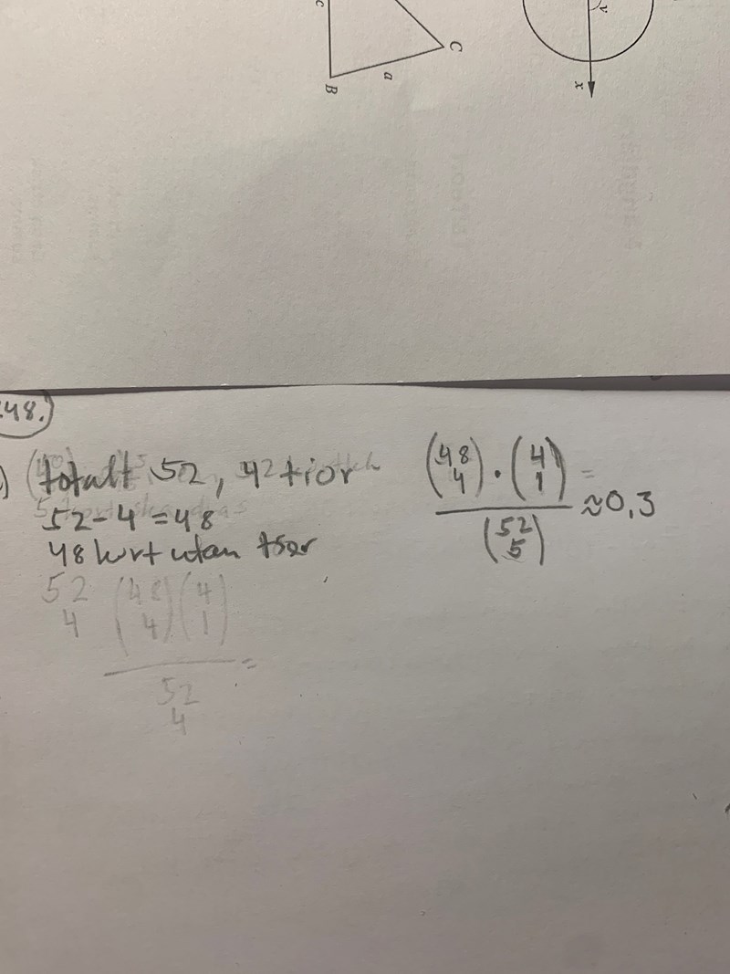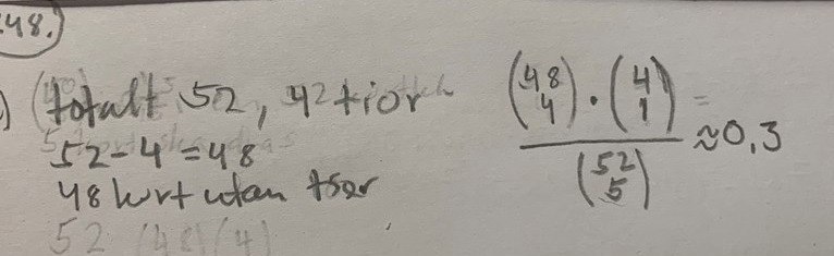 Jag har gjort klart uppgift a) men förstår inte riktigt varför jag gjort som jag gjort, exempelvis, varför tar man 48 över 4? Och multiplicerar det med 4 över 1? Förstår att man ska ta fem kort från kortleken och därför delar man men med 52 över 5.