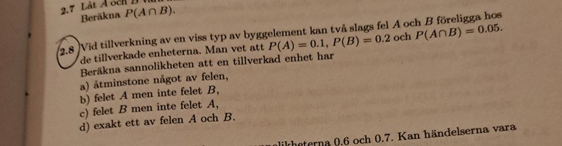 Ok.  Men det finns ett samband som säger komplement P(B^c)=1-P(B) där B^c är komplementet till B och tolkade som att det var P(B^c) de var ute efter. Jag inser inte något med venndiagram tyvärr förutom AsnittB och AUB och sen är jag ganska dålig på venndiagram.  Hur får du 0.05?