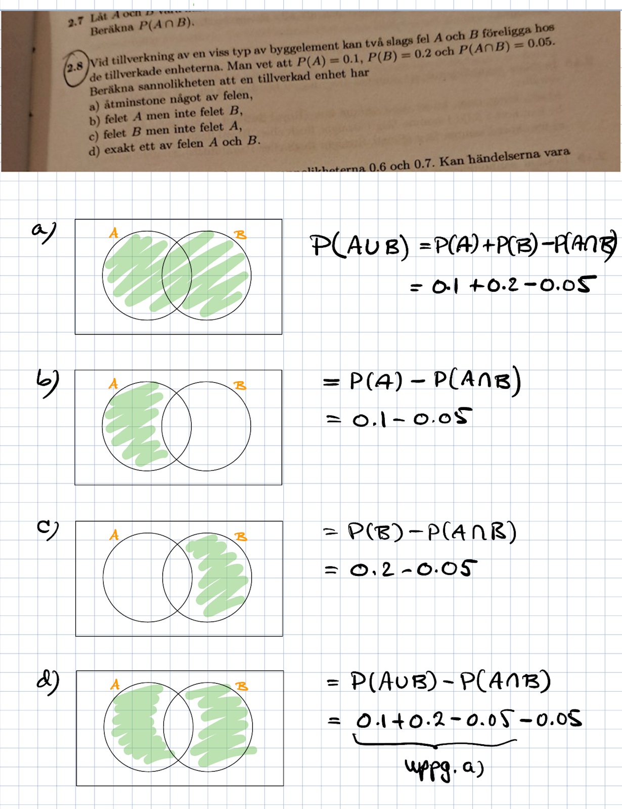 Använd Venn-diagrammet till c)+d) så tror jag du löser dem galant.