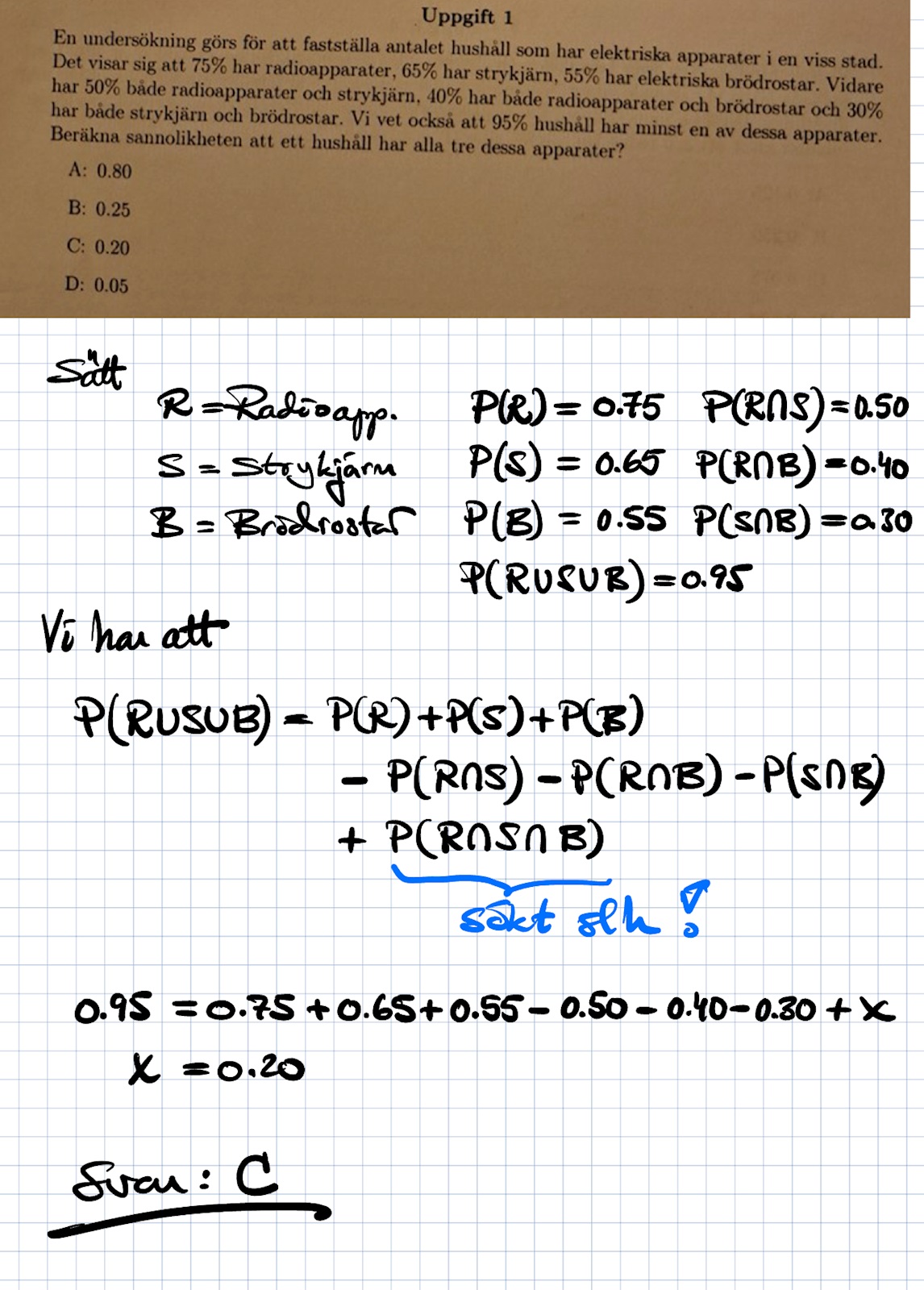 Okej för när jag antar att de är det så får jag P(AsnittBsnittC)=0.268 mha P(A)×P(B)×P(C). Jag får sen 0.75+0.65+0.55-0.5-0.4-0.3-0.268 =1.018 vilket inte stämmer med alternativen.