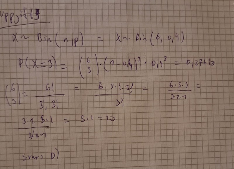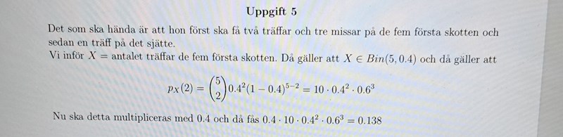 Yes nu är jag med. Då söker vi P(X=2 av 5 skott )=(5 2)*0.4^2*(1-0.4)^3. Men varför multiplicerar vi sen med 0.4 ?