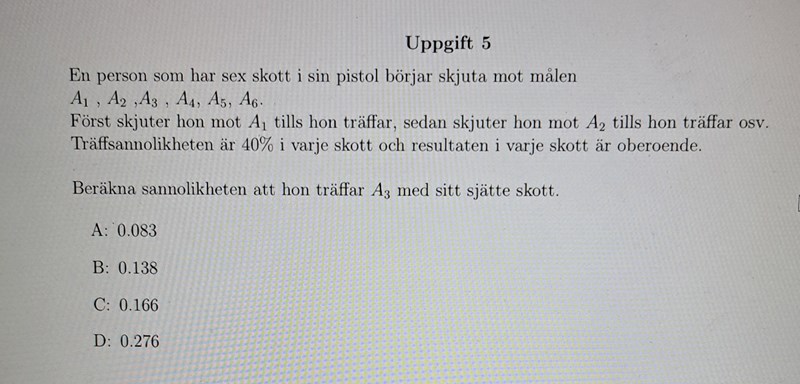 destiny99 skrev:Men hur kan vi ha 5 skott när uppgiften gav oss 6 skott? Du menar att hon måste träffa A1 och A2 först 2 gånger och sen inte träffa A4, A5 och A6 och sen träffa bara A3?