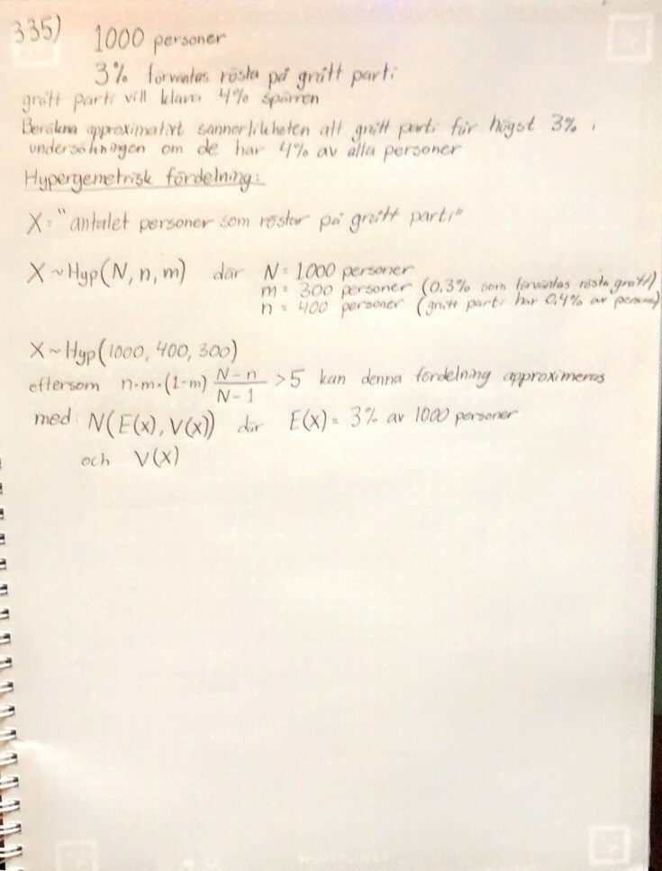 Försöker förstå mig på denna uppgift, men förstår inte riktigt vad jag håller på med. Kan någon försöka hjälpa mig att förstå, för det första hur ska jag identifiera vilken typ fördelning jag kan skriva detta problem som? Hypergeometrisk, Binomialfördelning?