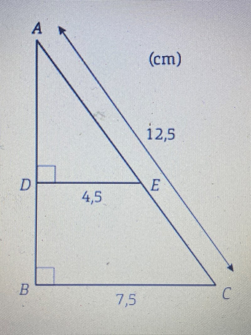 Jag har kommit fram till att det måste vara transversalsatsen jag borde använda mig av (om jag inte har fel). Än sålänge har jag skrivit sträcka BC/DE (7,5/4,5), men jag kommer liksom inte vidare sen. Jag ser heller inte hur sträckan AC på 12,5 kan läggas in i en uträkning.