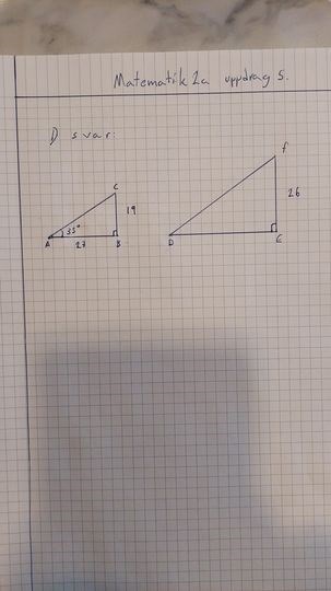 Jag förstår att jag ska ta DE/AB = EF/BC. Men då blir det DE/27 = 26/19 som blir 1,37. Hur jag kommer vidare?