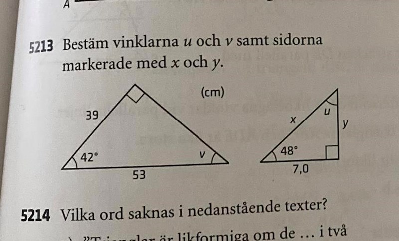 Får att förhållandet blir 53/x = 39/y = z/7 (döpte den okända sifan i stora triangeln till z.