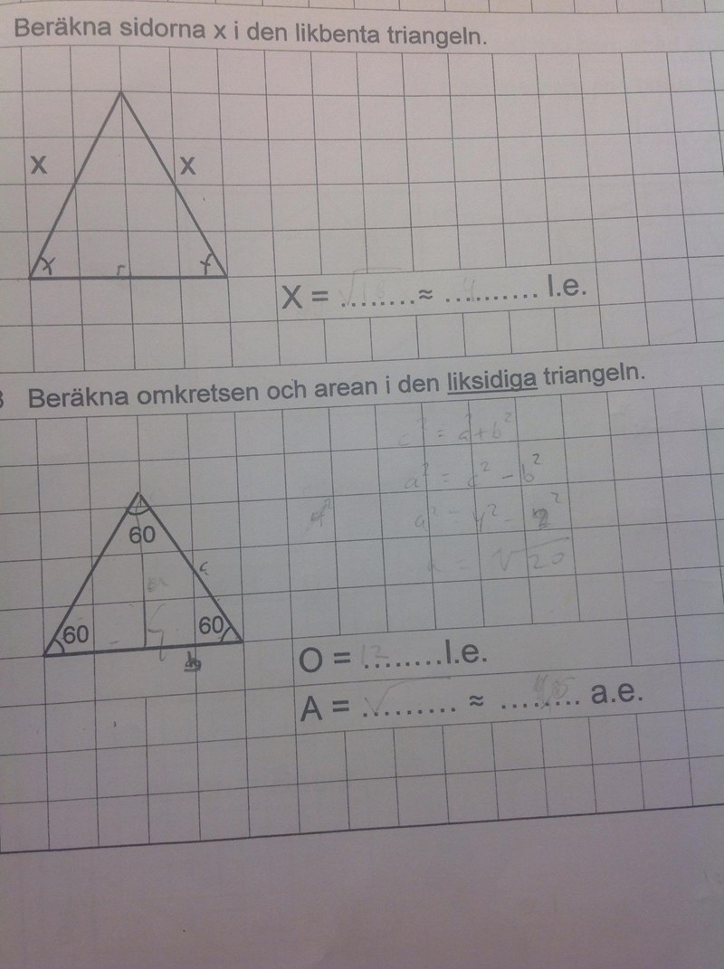 Stokastisk skrev :Hypotenusan är 4 l.e och ena kateten är 2 l.e, om x är höjden (den andra kateten), då ska det gälla att