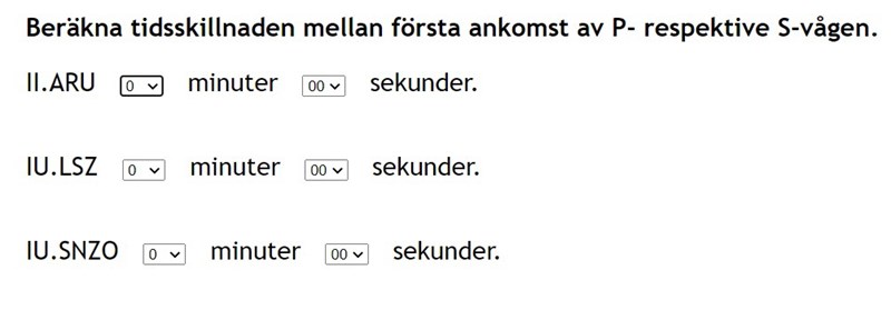 jag läser geologi så har inte lagt in detta rätt för man kunde inte välja det, men hoppas någon kan hjälpa mig här ändå. Jag förstår att det borde vara att bara beräkna skillnaden mellan tidena för P-vågen och S-vågen i respektive avläsning men utan chans att skriva ut sidan eller utan linjal har jag svårt att få rätt på att läsa av ankomsttiderna korrekt. Kan någon hjälpa mig få rätt på hur jag ska tänka och hur nu lägger upp det, tack! Man kan svara i x minuter och x sekunder.
