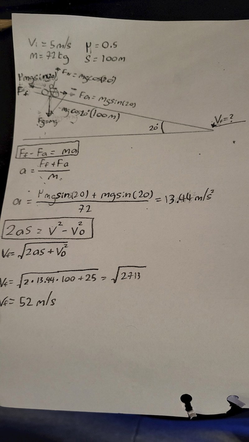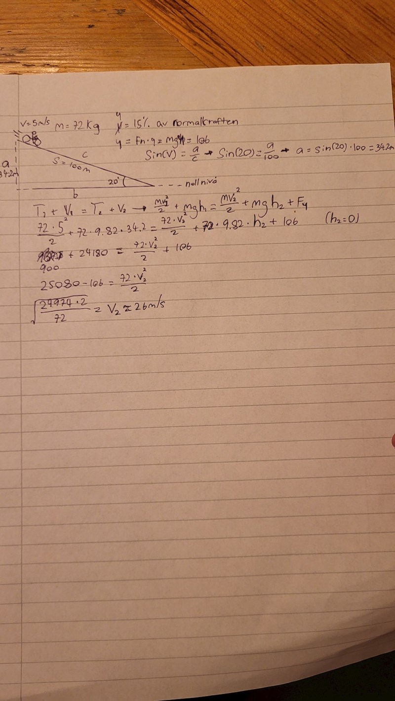 En cykel som åker ner för en nedförsbacke (100m lång) som är vinklad till 20 grader. Totala massan av cyklen och person är 72kg och cykeln åker i hastigheten 5m/s i början av backen. Friktionen är "50%" vilket jag antar betyder att friktionstalet är 0.5.
