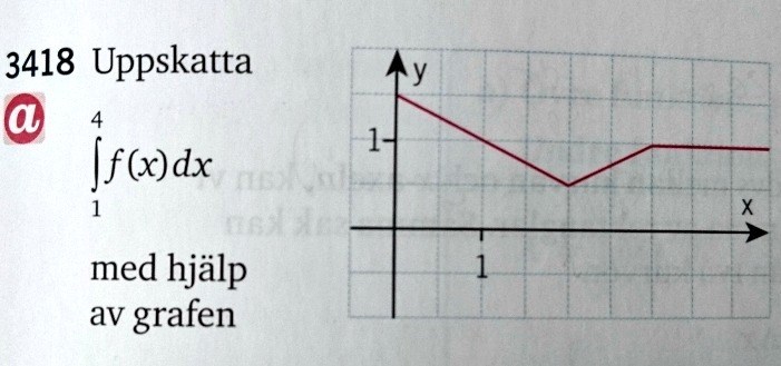 Om jag drar ett strek vid x=3 och y=0.5, har jag en lång rektangel 3*0.5= 1.5 a.e, plus en stor triangel med area (2*1/2) dvs 1, en mindre rektangel (1*0.5/2) dvs 0.25, och en sista kvadrat med area 1. Som blir 3,75 a.e?