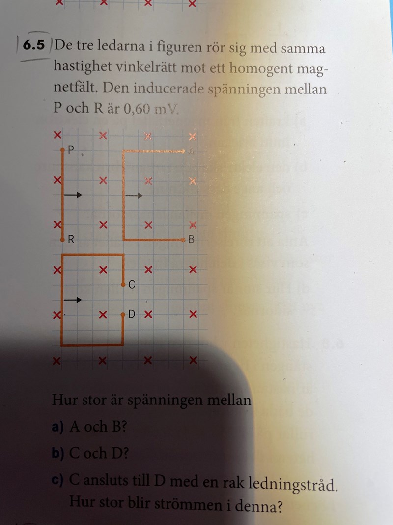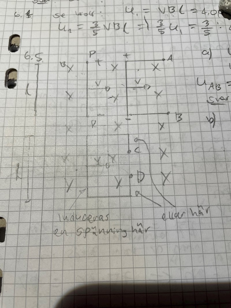 Behöver hjälp med uppgift b). Jag förstår inte vilken del av ledaren som det induceras en spänning på. Både den bakre samt de två främre delarna är vinkelräta mot magnetfältet och hastigheten, eller?