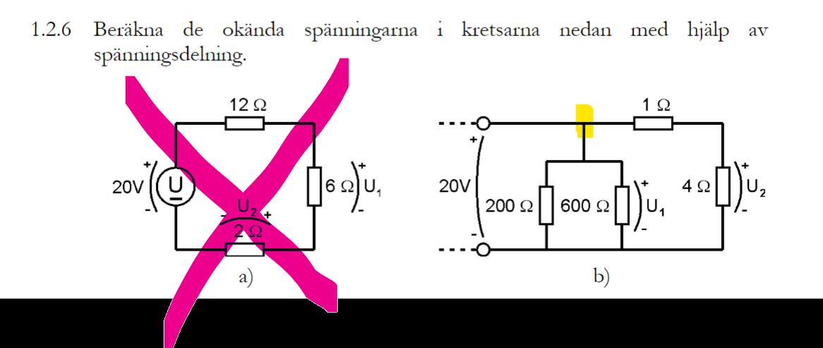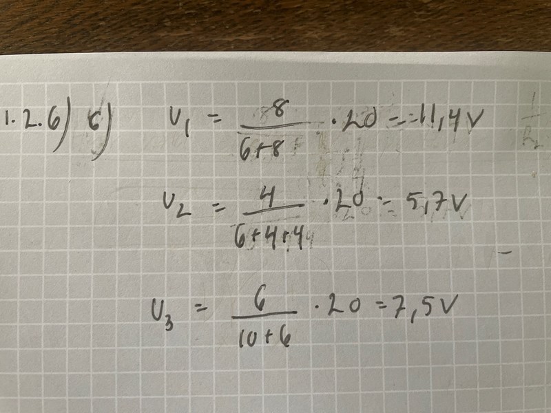 Jag har gått vidare till uppgift c) men stöter på patrull även där. U3 får jag rätt på men ej på U1 och U2. Jag har kollat en väg i taget och använt formeln för spänningsdelning. Behöver jag göra något särskilt med resistansen på 6ohm då den ingår i både vägen för U1 och U2?