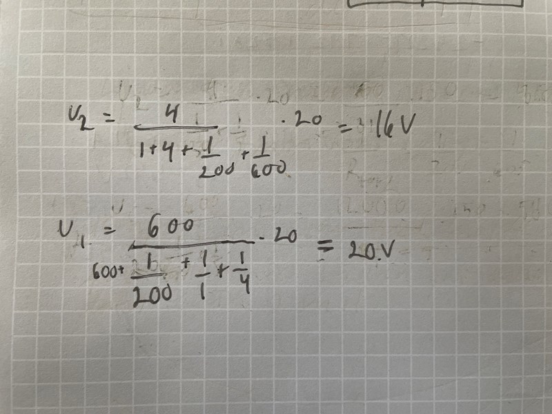 Jag har sett att spänningen ska bli 20v för U1 som du säger, är detta för att strömmen kan gå ett varv och då endast gå genom resistansen på 600ohm? Efter att ha sett vad svaret ska bli och testat olika sätt med siffrorna får jag rätt svar med dessa beräkningarna. Är det korrekta beräkningar? Varför blir det 1/200 på U1 och inte 200? Är det för att de är parallellkopplade?