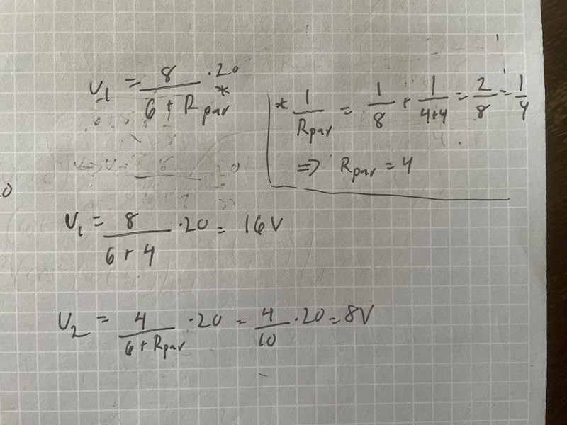 Jag hänger fortfarande inte med helt. Jag förstår nu att motståndet blir 10ohm i nämnaren men får mina svar till U1=16V och U2=8V, båda är alltså dubbelt så stora som de ska vara. Har jag tänkt fel i dessa beräkningarna?