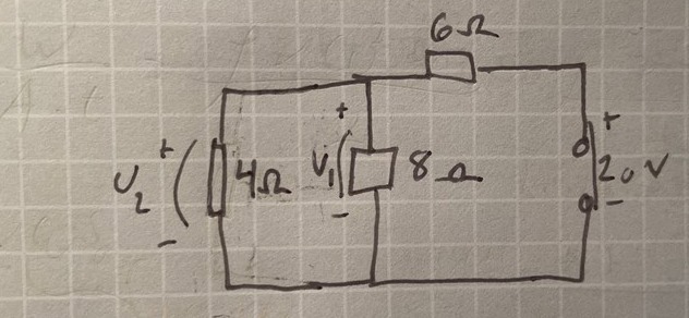 Så för att räkna U2 behöver du bara tänka på att det står 20 volt över 1 Ω i serie med 4 Ω. Det går med huvudräkning.