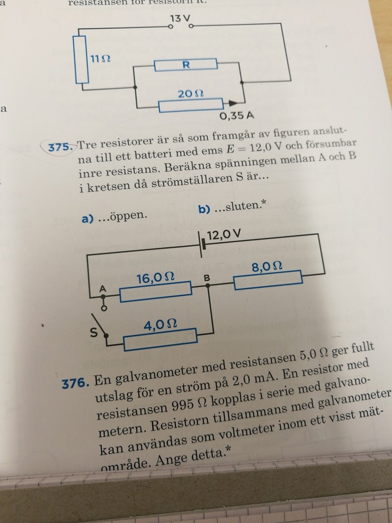 I uppgift 375a) det går ingen ström i resistansen 4,0 ohm och då blir väl Up= E? Jag antog att spänningen mellan punkt A och B är 12 V. Facit håller dock ej med och jag vet ej varför, kan jag glömt att uppmärksamma något?