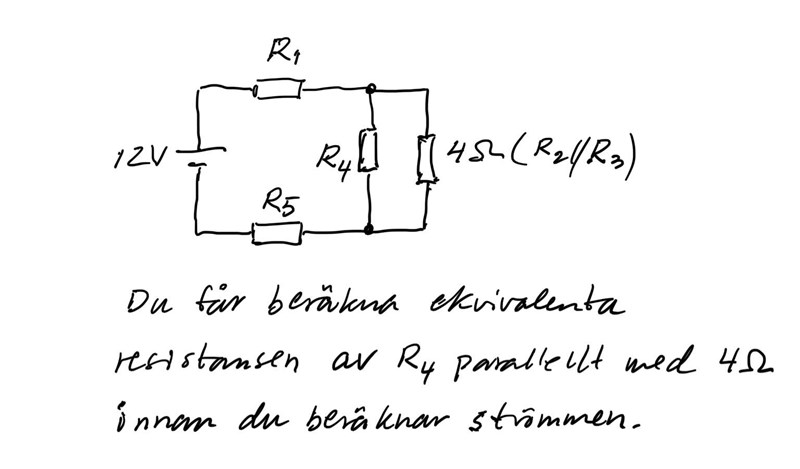 Pieter Kuiper skrev:R2, R3, R4 är alla parallella med varandra, det är samma spänning över dessa tre.
