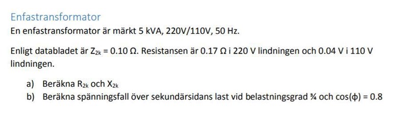Har problem med en uppgift om enfastransformatorer där man ska beräkna spänningsfall över sekundärsidan med belastningsgrad 3/4 och cos(phi) = 0.8. Lägger upp en bild nedan.