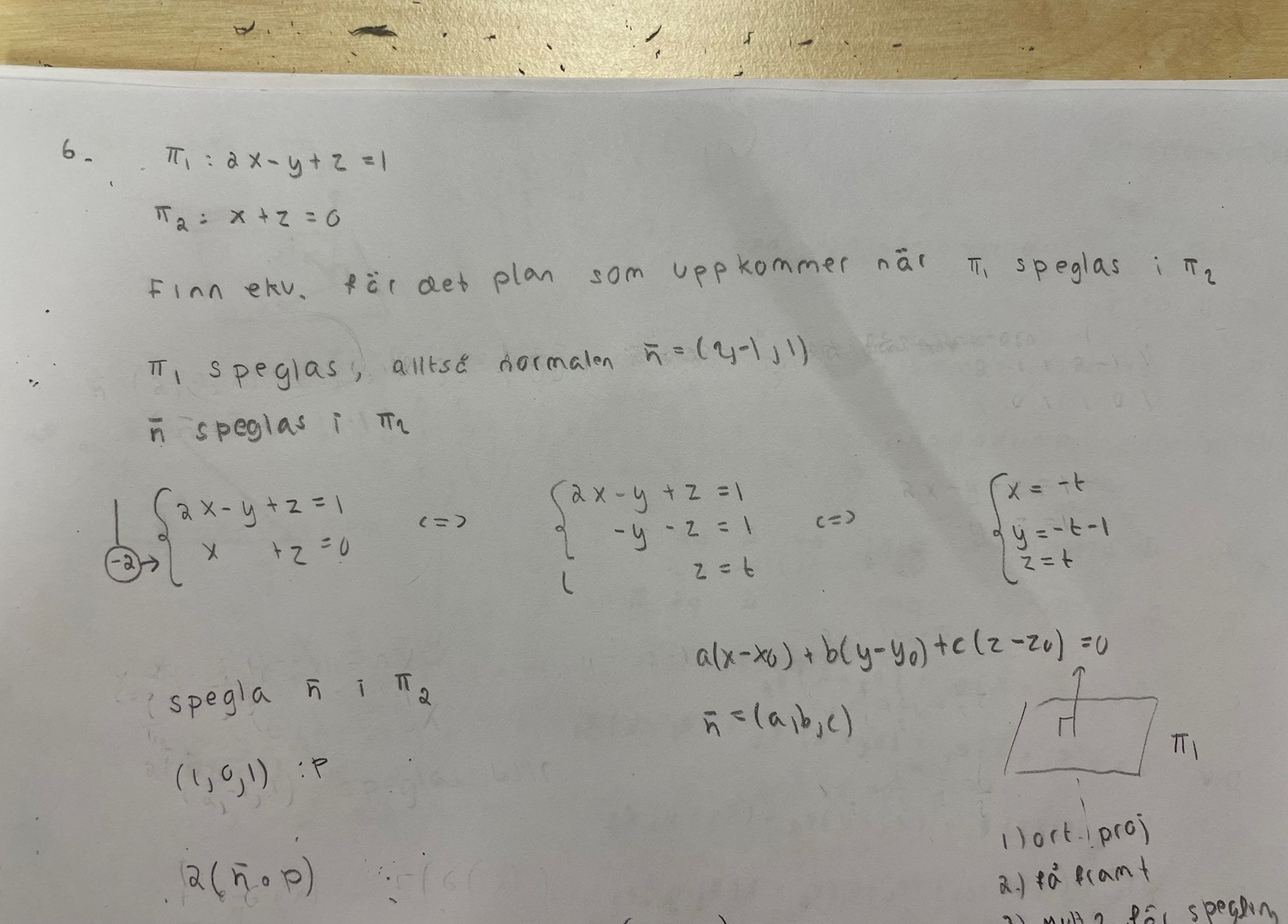 vi vill utgå från, tänkte liksom att om vi har punkter i π1 så är ju de som ligger i planet sin egna spegelbild om du förstår vad jag menar?