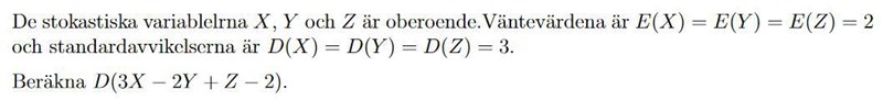men här kommer jag inte vidare. Jag är inte säker på att man ens ska skriva om V(X) til E(X2)-E2(X). I lösningsförslaget har man nämligen bara satt in V(X)=V(Y)=V(Z)=9. Hur har man fått ut detta? Jag ser visserligen att V(X)=9=D(X)2=D(X)E(X), men jag känner inte till ett sådant samband.