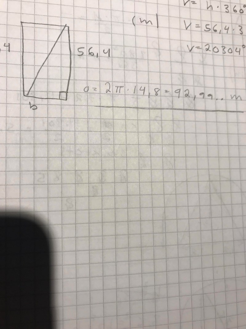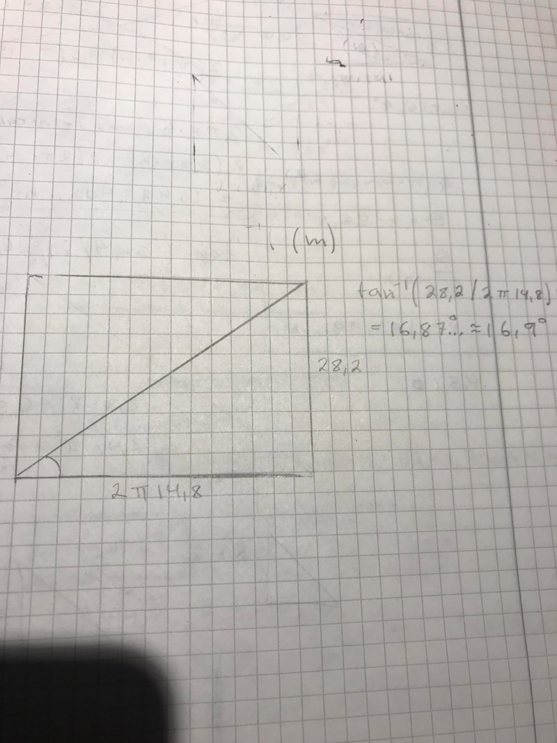 Höjden är 56,4 meter. Inuti denna cylinder bildas en triangel jag kan få en vinkel från. Jag vet inte om jag räknade ut omkretsen av spiralen rätt, eftersom den inte följer cylindern jämnt runt, utan går i en vinkel längs spiralen. Förstår inte riktigt hur jag ska kunna få basen, om nu höjden är korrekt med 56,4 m.