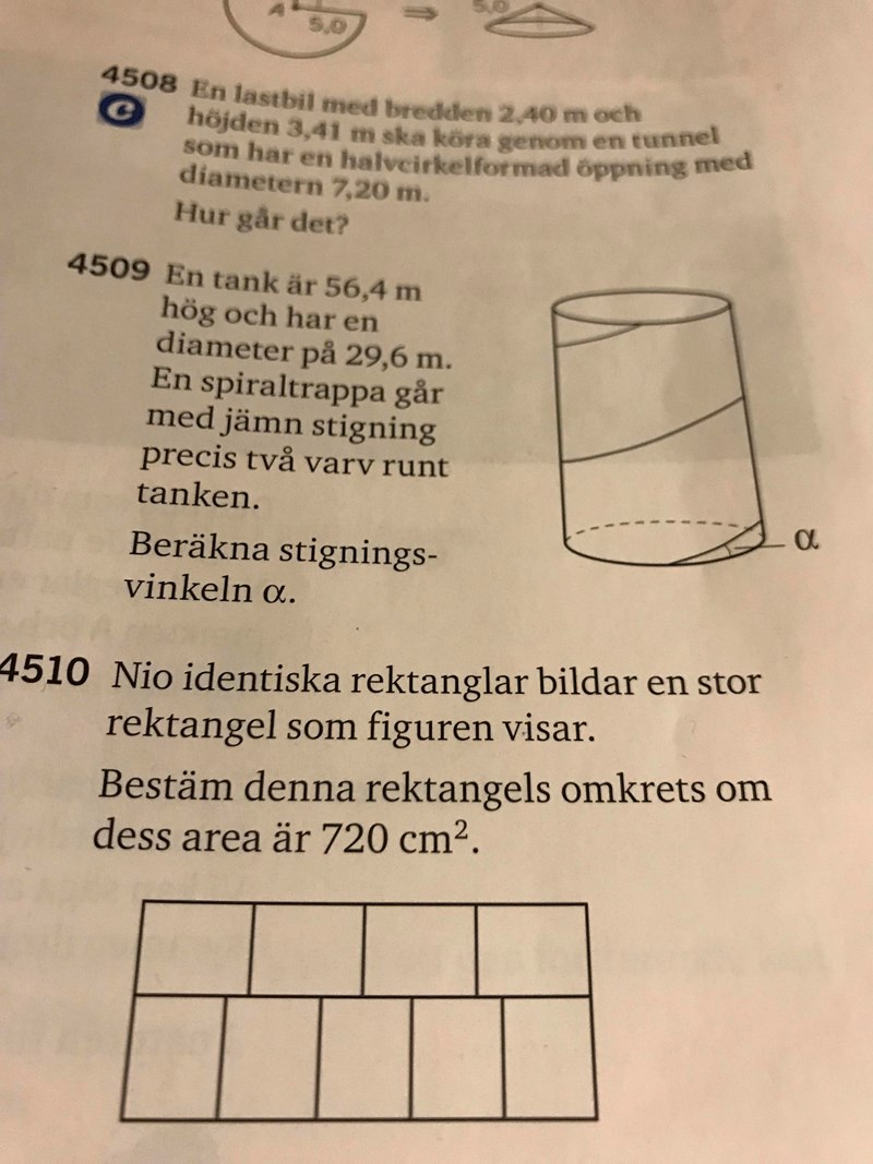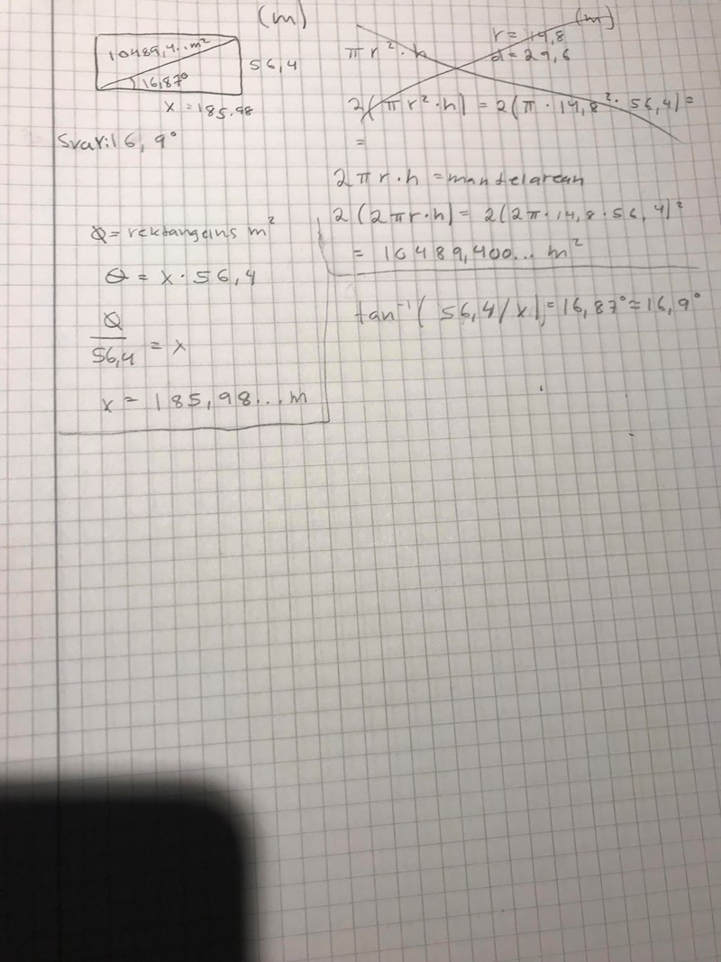 Jag inser att hela mantelarean har en sida som är 56,4 m och att den andra bör vara x meter. Detta ska tillsammans multipliceras till kvadratmeter. Spiralen går två varv runt cylindern och då är arean dubbelt så stor. Har gjort den beräkningen.