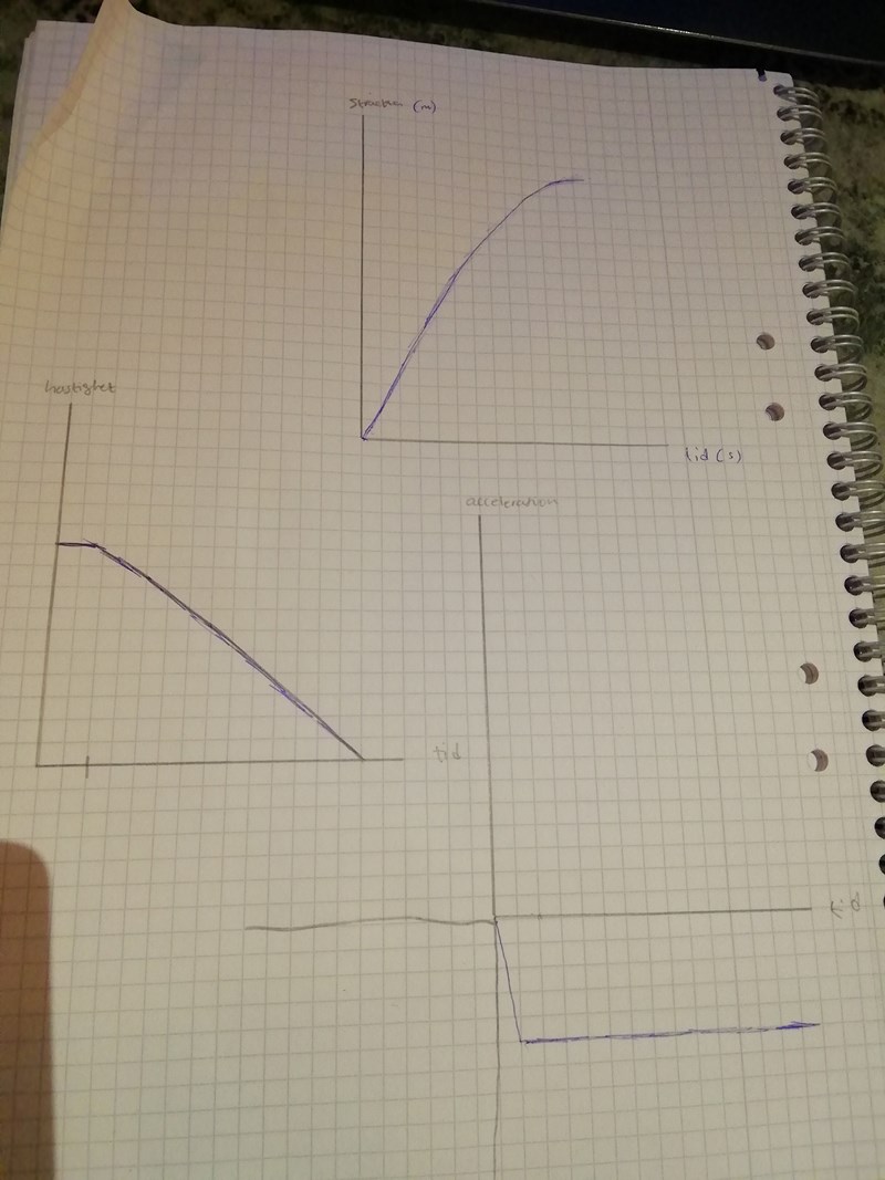 b) Rita tre diagram för hela förloppet i a). En med sträcka tid-graf, en med hastighet tid-graf och en acceleration tid-graf.
