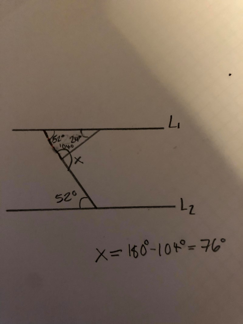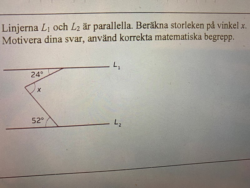 Om du drar vidare linjerna så att det blir 2 trianglar (triangeln underst blir ganska lång) så kommer allt bli tydligare. För då kan du se att 52° är alternatvinkel till en av sidorna på den andra triangeln. Utifrån det kan du använda faktumet att triangelns innervinkel alltid är 180, och därför addera 24° med 52° och subtrahera det från 180. Det blir 104°. Nu har vi den tredje vinkeln i triangeln där uppe. Nu vet vi att vinkeln 104 är sidovinkel till vinkel X. Och vi VET att sidovinklar alltid addera och blir 180. Därför kan du subtrahera 104 från 180 och då få fram vinkel X. Svar: 76°.