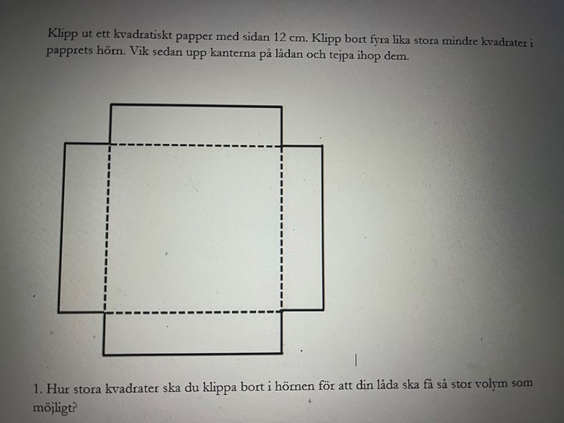 jag har fått upp i uppgift att konstruera en låda utifrån måtten 12 cm. Jag ska klippa bort fyra lika stora kvadrater i hörnen, och frågan är hur många kvadrater jag måste klippa bort för att få största möjliga volym?