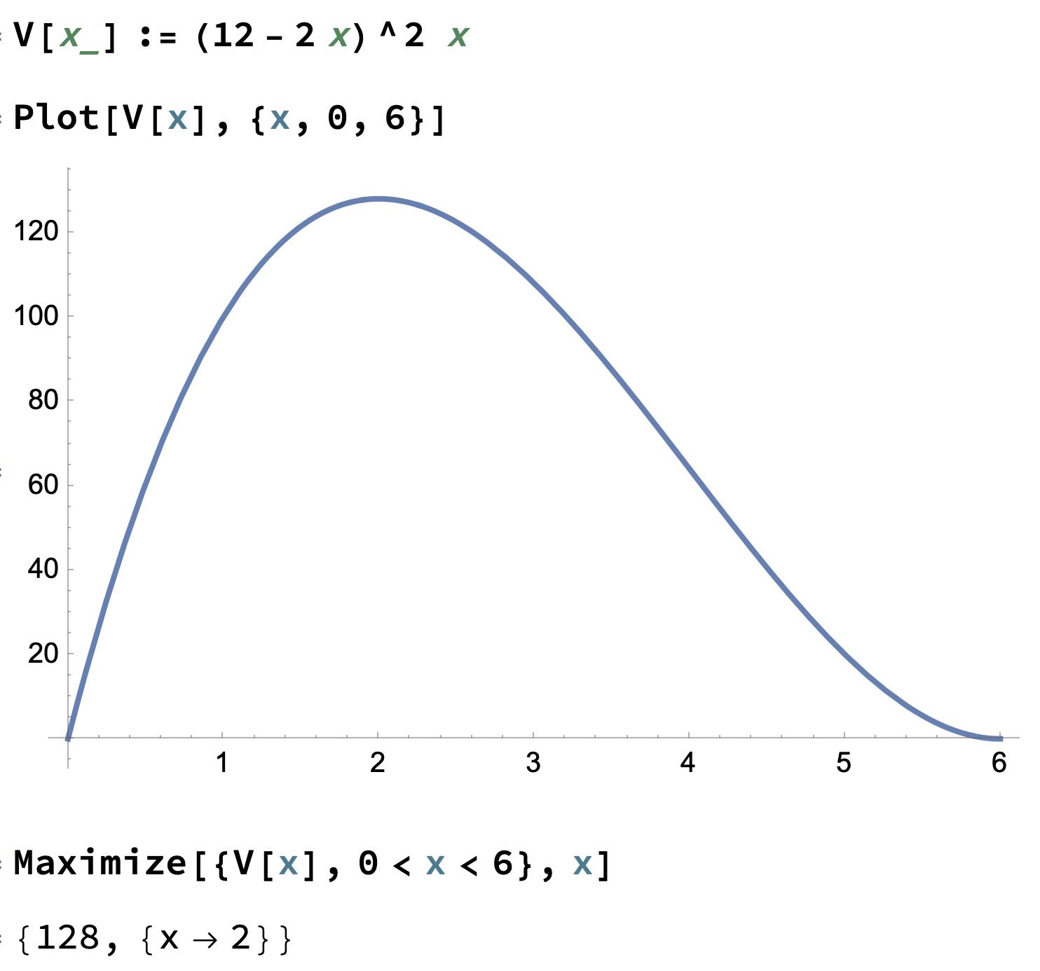 V(x) = b l h = (12-2x)^2 x = 4 x^3-48 x^2+144 x