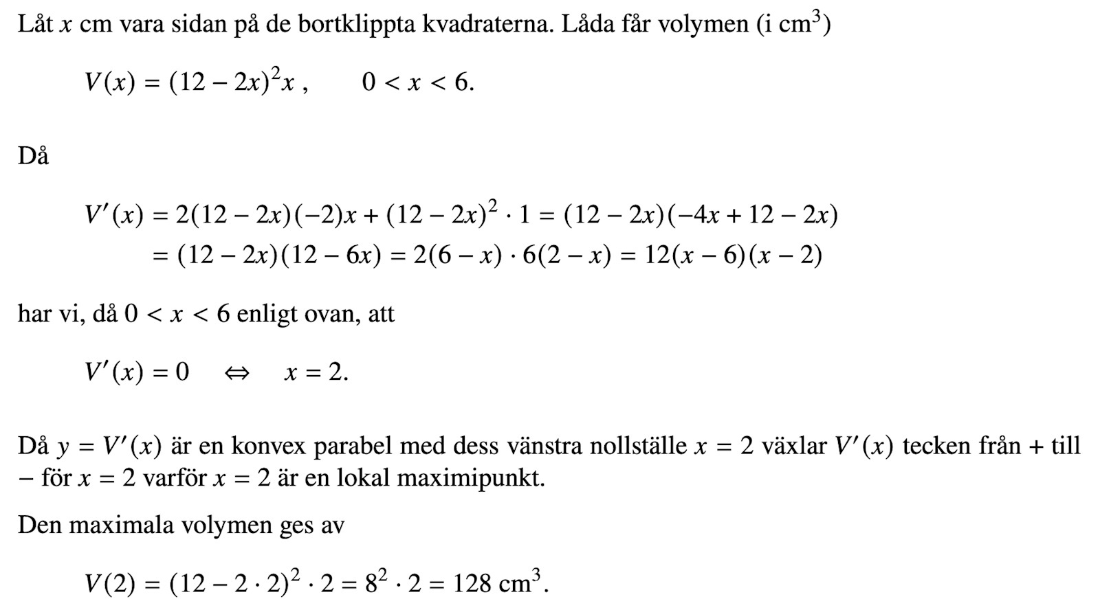 Om man klipper bort x cm (i kvadrat) så blir bottensidan b=l=12-2x och höjden h=x. Volymen är då