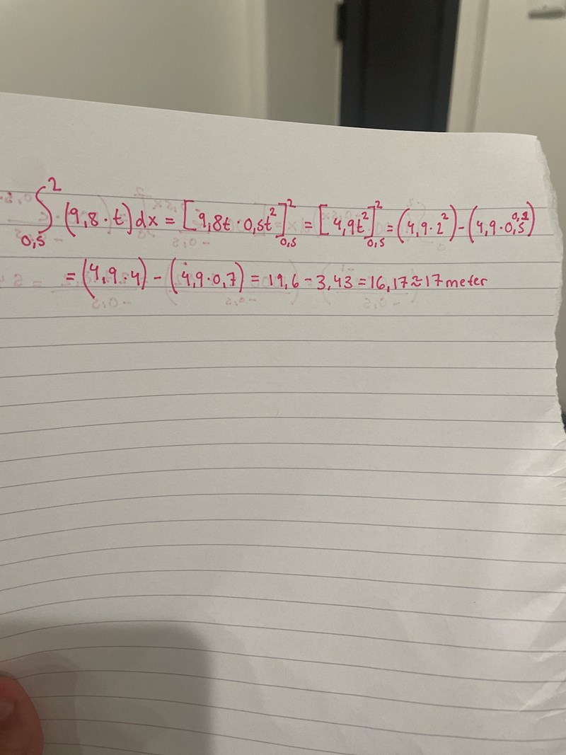 Julialarsson321 skrev:Så det blir (4,9*4)-(4,9*0,5) = 19,6 - 1,225= 18,375 = 18 meter?