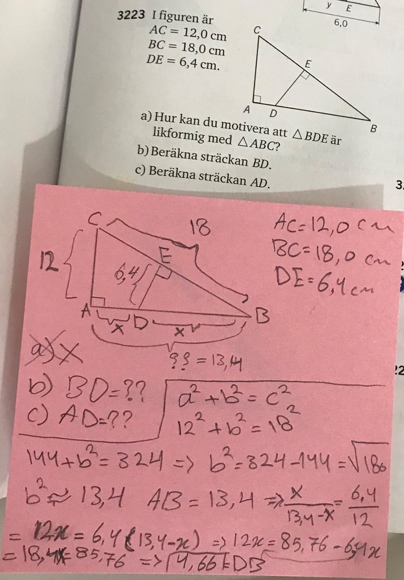 för att hitt svar till b) jag har använt Pythagorassats för AB först och sen likformighet för DB men som du ser de har blivit 4,66, och det är fel.