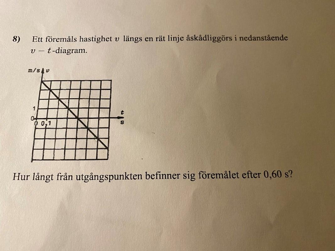 Notera: Vid tiden t=0,4 är föremålet längst bort. Sen är hastigheten negativ och föremålet rör sig tillbaka. Men det behöver man inte veta för att lösa uppfigten, du får totalsträckan med formeln ovan. Men bra att kunna se det i diagrammet.