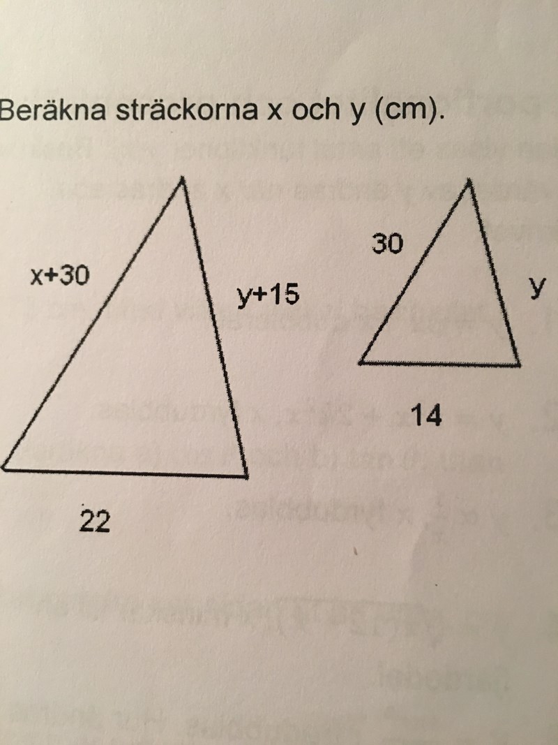Då ska du få samma tal om du delar samma sidor på de olika trianglarna. Så tex 22/14 = (x+30)/30
